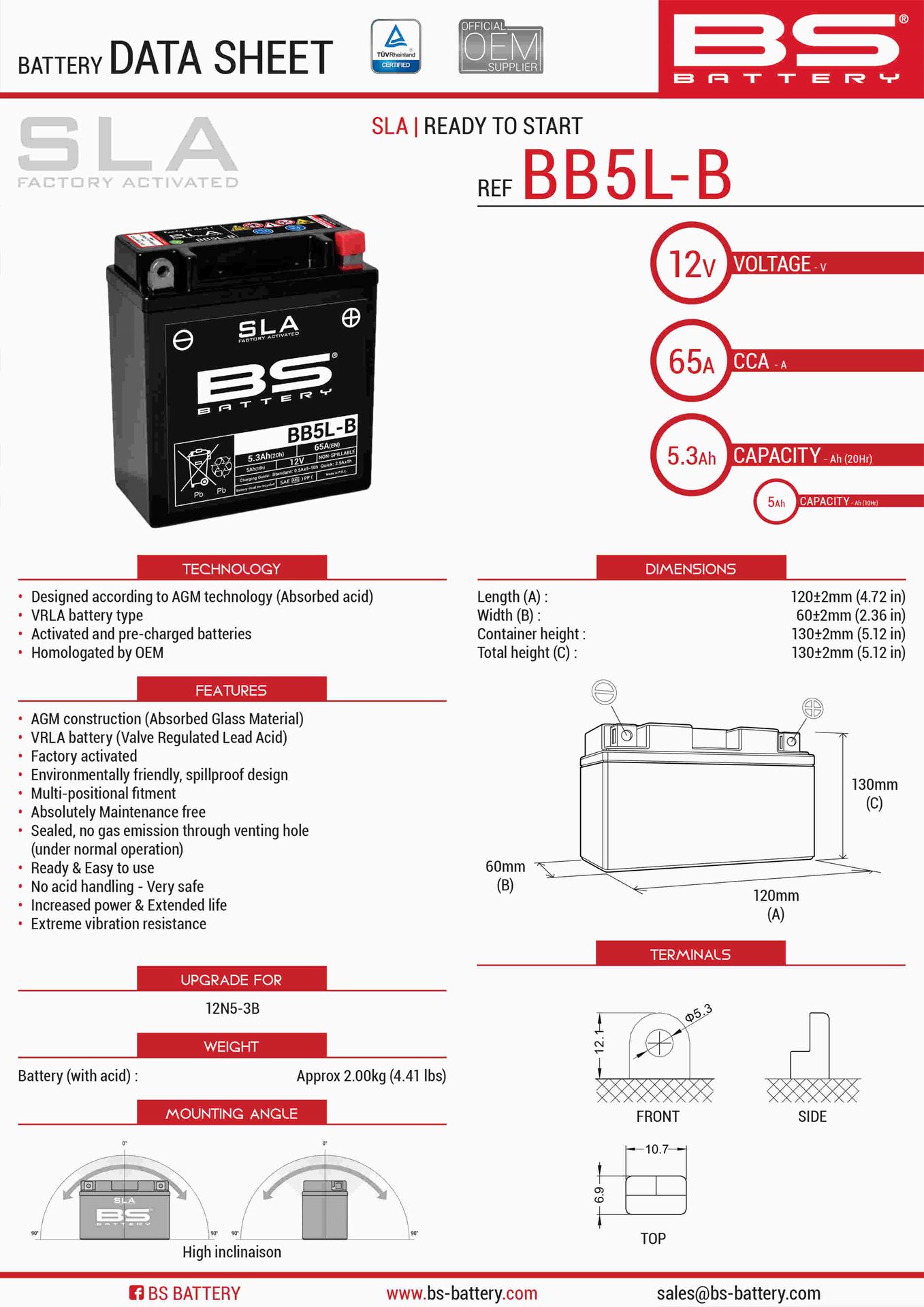 Akumulator BB5L-B (FA) (YB5L-B) (12N5-3B) 12V 5AH 120X60X130 Bezobsługowy – Zalany (65A) (6) | BS