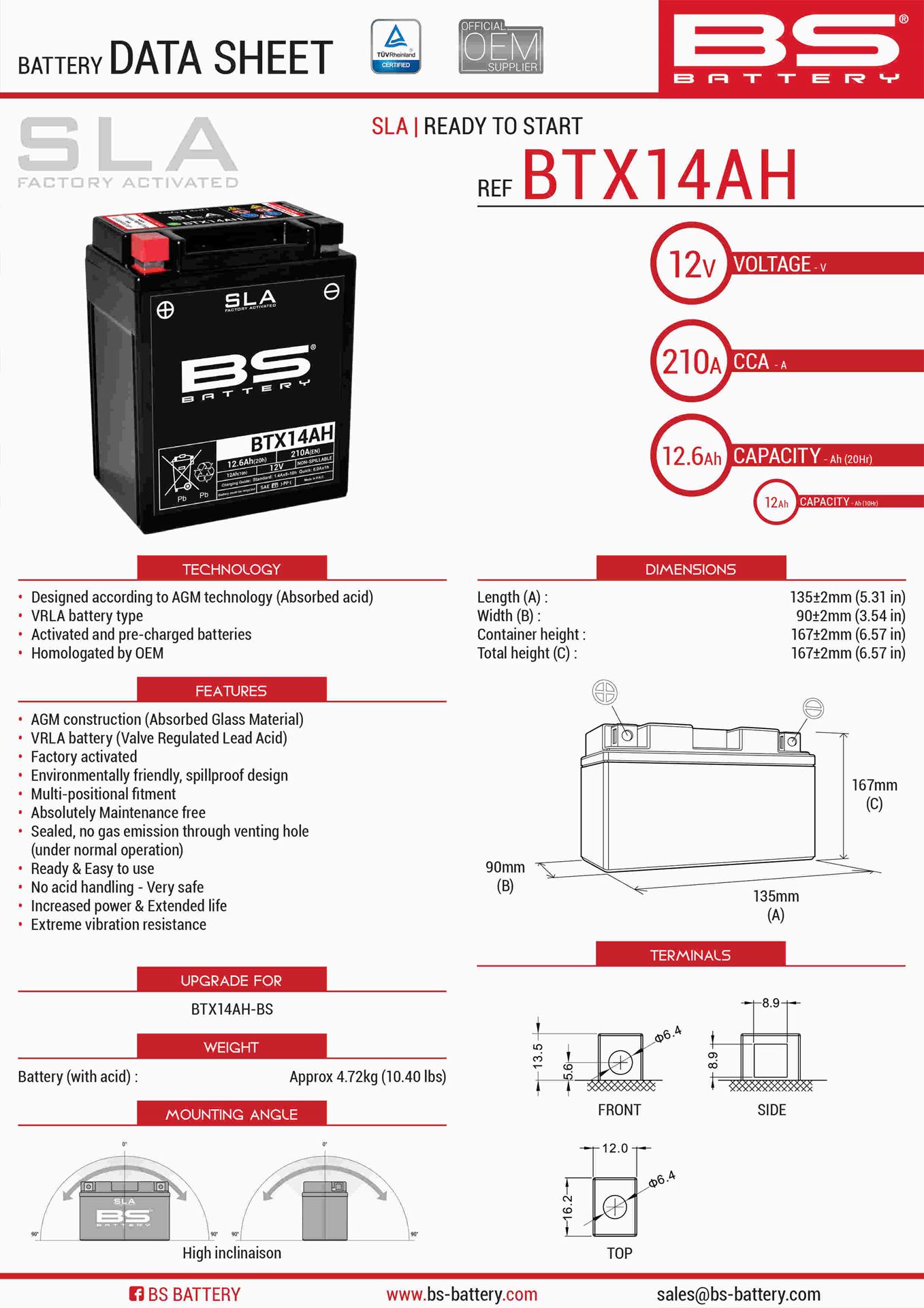 Akumulator BTX14AH (FA) (YTX14AH-BS) 12V 12AH 135X90X167 Bezobsługowy – Zalany (210A) (4) | BS