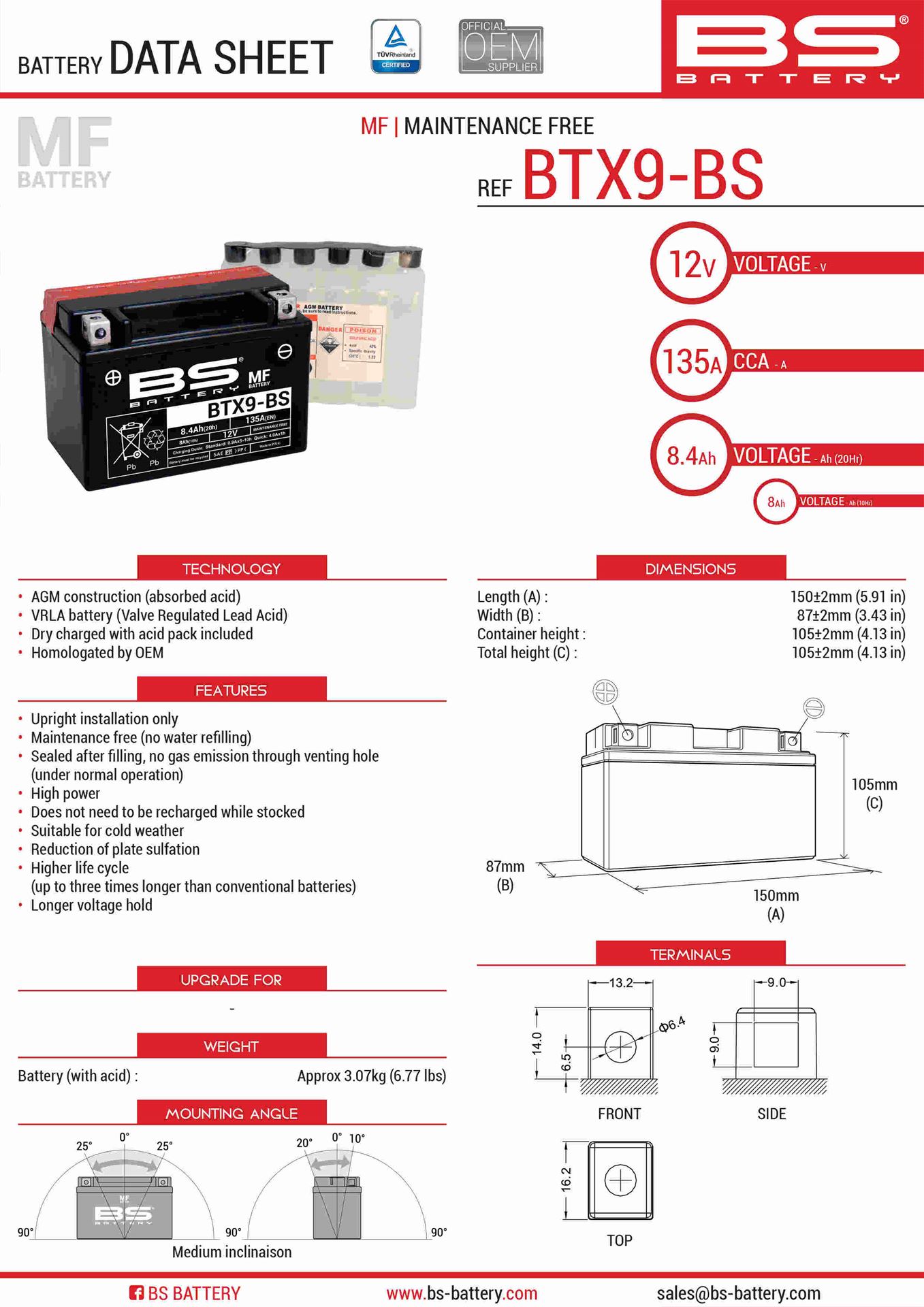 Akumulator BTX9-BS (YTX9-BS) 152X88X106 12V 8AH Bezobsługowy – Elektrolit Osobno (120A) Ue2019/1148 (6) | BS