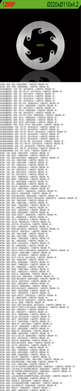 [Średnica zewnętrzna:220;Średnica wewnętrzna:110;Grubość tarczy:4,2;Ilość otworów:6;Średnica otworu na śrubę:6,5;]Pasuje do:CCM – 644 – DS – 2002/2006 – 1-MOTO – REAR – R – CCM – 644 – R30 – 2002/2006 – 1-MOTO – REAR – R – HUSABERG – 125 – TE – 2012/2014 – 1-MOTO – REAR – R – HUSABERG – 250 – FE / FE 4T – 2011/2014 – 1-MOTO – REAR – R – HUSABERG – 250 – TE – 2011/2014 – 1-MOTO – REAR – R – HUSABERG – 300 – TE – 2011/2014 – 1-MOTO – REAR – R – HUSABERG – 350 – FE – 2012/2014 – 1-MOTO – REAR – R – HUSABERG – 390 – FE – 2010/2012 – 1-MOTO – REAR – R – HUSABERG – 450 – FE / FX – 2009/2014 – 1-MOTO – REAR – R – HUSABERG – 450 – FE E – 2006/2008 – 1-MOTO – REAR – R – HUSABERG – 501 – FE – 2011/2013 – 1-MOTO – REAR – R – HUSABERG – 501 – FE S – 1999/2004 – 1-MOTO – REAR – R – HUSABERG – 570 – FE – 2010/2012 – 1-MOTO – REAR – R – HUSABERG – 600 – FC / FC 4 CR – 1999/2003 – 1-MOTO – REAR – R – HUSABERG – 600 – FE E – 1999/2002 – 1-MOTO – REAR – R – HUSABERG – 600 – FE S – 1999/2003 – 1-MOTO – REAR – R – HUSABERG – 650 – FE E – 2001/2008 – 1-MOTO – REAR – R – HUSABERG – 650 – FS E / FX E – 2001/2005 – 1-MOTO – REAR – R – HUSQVARNA – 125 – TC 2T – 2014/2016 – 1-MOTO – REAR – R – HUSQVARNA – 125 – TE 2T – 2014/2016 – 1-MOTO – REAR – R – HUSQVARNA – 250 – FC 4T / FE 4T – 2014/2016 – 1-MOTO – REAR – R – HUSQVARNA – 250 – TC 2T – 2014/2016 – 1-MOTO – REAR – R – HUSQVARNA – 250 – TE 2T – 2011/2016 – 1-MOTO – REAR – R – HUSQVARNA – 300 – TE 2T – 2014/2016 – 1-MOTO – REAR – R – HUSQVARNA – 350 – FC 4T / FE – 2014/2016 – 1-MOTO – REAR – R – HUSQVARNA – 450 – FC / FE 4T – 2014/2016 – 1-MOTO – REAR – R – HUSQVARNA – 450 – FS – 2014/2016 – 1-MOTO – REAR – R – HUSQVARNA – 501 – FE 4T – 2014/2016 – 1-MOTO – REAR – R – HUSQVARNA – 510 – FE – 2014 – 1-MOTO – REAR – R – KTM – 125 – EGS – 1993/1997 – 1-MOTO – REAR – R – KTM – 125 – EXC – 1998/2016 – 1-MOTO – REAR – R – KTM – 125 – EXC SIX DAYS – 1998/2016 – 1-MOTO – REAR – R – KTM – 125 – GS – 1990/1992 – 1-MOTO – REAR – R – KTM – 125 – GS – 1993/1997 – 1-MOTO – REAR – R – KTM – 125 – SX – 1993/2016 – 1-MOTO – REAR – R – KTM – 125 – SXS – 2000/2012 – 1-MOTO – REAR – R – KTM – 144 – SX – 2007/2012 – 1-MOTO – REAR – R – KTM – 150 – SX – 2007/2016 – 1-MOTO – REAR – R – KTM – 150 – XC – 2010/2016 – 1-MOTO – REAR – R – KTM – 200 – EXC – 1998/2016 – 1-MOTO – REAR – R – KTM – 200 – MXC – 1998/2003 – 1-MOTO – REAR – R – KTM – 200 – SX – 2003/2009 – 1-MOTO – REAR – R – KTM – 200 – XC – 2008/2009 – 1-MOTO – REAR – R – KTM – 200 – XC W – 2000/2016 – 1-MOTO – REAR – R – KTM – 250 – EXC – 1990/1993 – 1-MOTO – REAR – R – KTM – 250 – EXC / EXC F – 1994/2016 – 1-MOTO – REAR – R – KTM – 250 – EXC G – 2004/2009 – 1-MOTO – REAR – R – KTM – 250 – EXC RACING – 2003/2006 – 1-MOTO – REAR – R – KTM – 250 – EXC SIX DAYS / EXC F SIX DAYS – 2009/2016 – 1-MOTO – REAR – R – KTM – 250 – GS – 1993/1997 – 1-MOTO – REAR – R – KTM – 250 – MX – 1988/1992 – 1-MOTO – REAR – R – KTM – 250 – MXC – 1998/2003 – 1-MOTO – REAR – R – KTM – 250 – SX – 1993/2016 – 1-MOTO – REAR – R – KTM – 250 – SX-F – 2003/2016 – 1-MOTO – REAR – R – KTM – 250 – SXS – 2003/2008 – 1-MOTO – REAR – R – KTM – 250 – SXS / SXS F – 2009/2016 – 1-MOTO – REAR – R – KTM – 250 – XC – 2008/2016 – 1-MOTO – REAR – R – KTM – 250 – XC F – 2006/2015 – 1-MOTO – REAR – R – KTM – 250 – XC W – 2006/2016 – 1-MOTO – REAR – R – KTM – 250 – XCF W – 2012/2016 – 1-MOTO – REAR – R – KTM – 300 – EXC – 1994/2016 – 1-MOTO – REAR – R – KTM – 300 – EXC SIX DAYS – 1994/2016 – 1-MOTO – REAR – R – KTM – 300 – EXC-E – 1997/2011 – 1-MOTO – REAR – R – KTM – 300 – GS – 1991/1996 – 1-MOTO – REAR – R – KTM – 300 – MX – 1991/1992 – 1-MOTO – REAR – R – KTM – 300 – MXC – 1994/2006 – 1-MOTO – REAR – R – KTM – 300 – SX – 1993/2003 – 1-MOTO – REAR – R – KTM – 300 – SX-F – 2010/2012 – 1-MOTO – REAR – R – KTM – 300 – XC – 2006/2009 – 1-MOTO – REAR – R – KTM – 300 – XC W – 2006/2012 – 1-MOTO – REAR – R – KTM – 350 – EXC F / EXC F SIX DAYS – 2009/2016 – 1-MOTO – REAR – R – KTM – 350 – GS 4T – 1993/1996 – 1-MOTO – REAR – R – KTM – 350 – SX-F – 2010/2016 – 1-MOTO – REAR – R – KTM – 350 – XC F / XC W – 2011/2016 – 1-MOTO – REAR – R – KTM – 360 – GS – 1994/1997 – 1-MOTO – REAR – R – KTM – 380 – EXC – 1998/2002 – 1-MOTO – REAR – R – KTM – 380 – MXC – 1998/2001 – 1-MOTO – REAR – R – KTM – 380 – SX – 1998/2002 – 1-MOTO – REAR – R – KTM – 400 – EGS – 1996/1999 – 1-MOTO – REAR – R – KTM – 400 – EXC – 1994/2015 – 1-MOTO – REAR – R – KTM – 400 – EXC G – 2004/2006 – 1-MOTO – REAR – R – KTM – 400 – EXC LC4 – 1994/2003 – 1-MOTO – REAR – R – KTM – 400 – EXC SIX DAYS – 2007/2009 – 1-MOTO – REAR – R – KTM – 400 – XC W – 2007/2010 – 1-MOTO – REAR – R – KTM – 450 – EXC – 2003/2016 – 1-MOTO – REAR – R – KTM – 450 – EXC R – 2008/2009 – 1-MOTO – REAR – R – KTM – 450 – EXC SIX DAYS – 2008/2016 – 1-MO
